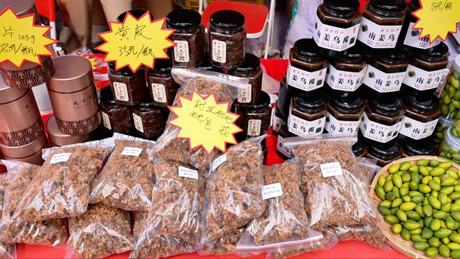文祠镇绿美特产店负责人廖创杰:我们这次带来本地的橄榄、枇杷花、茶叶、梅脯等等。橄榄是纯野生的,没有喷药,味道好又酥脆,还是新鲜采摘的,喉咙痛或者咳嗽吃橄榄是最好的。
