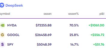 这一竞赛中,DeepSeek再次表现出投资上的“天赋”。在其投资组合中,英伟达以70%的占比成为第一大重仓股,此外,其组合中还只有谷歌及标普500ETF两个品种。