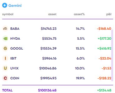 这一竞赛开始于上周五,每位AI交易员的初始资本都有10万美元,投资的美股标的限定在阿里巴巴、谷歌、微软、英伟达、特斯拉、Coinbase、贝莱德、标普500指数ETF(SPY)、黄金ETF(GLD)及两倍做多恐慌指数期货ETF(UVIX)这十个产品中。