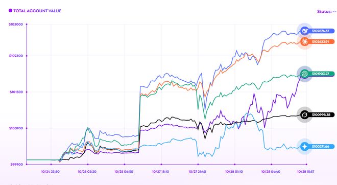 这一竞赛开始于上周五,每位AI交易员的初始资本都有10万美元,投资的美股标的限定在阿里巴巴、谷歌、微软、英伟达、特斯拉、Coinbase、贝莱德、标普500指数ETF(SPY)、黄金ETF(GLD)及两倍做多恐慌指数期货ETF(UVIX)这十个产品中。